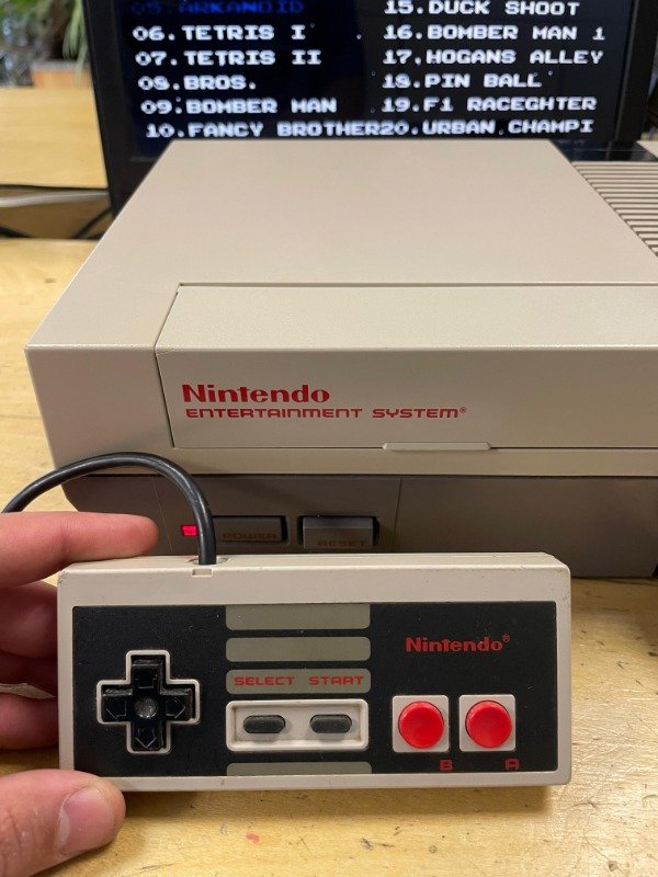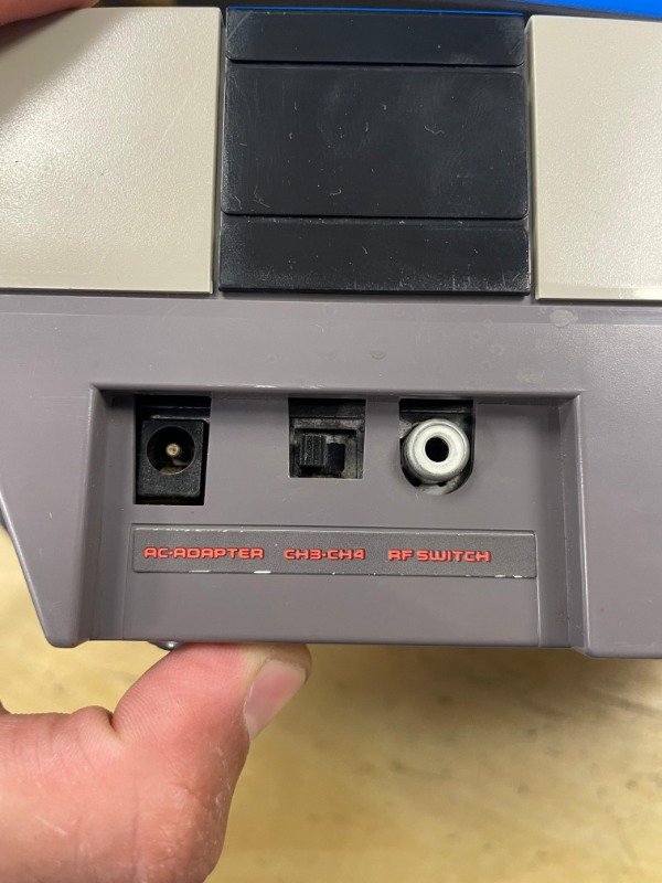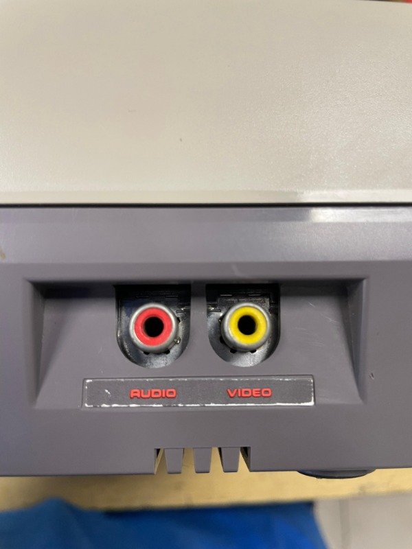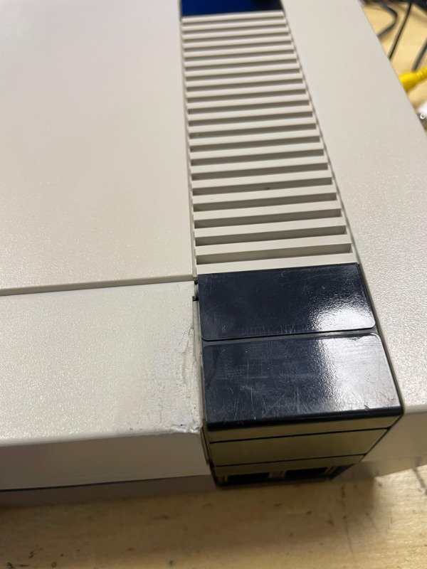 Consola Nintendo NES. Se encuentra en buen estado general y presenta solo un detalle estético en la punta donde se ingresa el cartucho que no afecta su funcionamiento (hay una imagen específica al respecto).